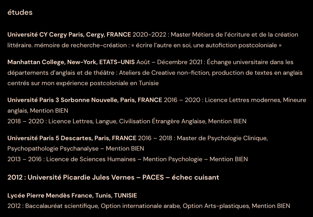 Vagues doutes revenant comme une ritournelle. Suffisamment ennuyeux pour gâcher toutes les expériences. Les teinter d’un voile d’échec. L’école a appelé mes parents à la dernière minute pour leur dire qu’on m’admettait au concours d’entrée à l’école française. On les a peut-être appelés si tard parce qu’on m’avait mis sur liste d’attente à l’origine. Peut-être que depuis le début je n’avais pas ma place. Je n’étais pas good enough. Que ça pavait déjà la route de l’absence de prépa, d’ENS, d’EHESS. Syndrome de l’imposteur. Sous ma carapace de diplômes trognon sanguinolent de mensonge.